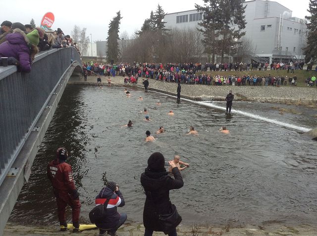 Vždycky zařazuji fotku sjezdovky na Šacberku, abychom mohli porovnat klimatické poměry v jednotlivých letech – dnes ale využiji jiného zdroje ke zprávě o počasí – už po sedmé se konalo novoroční plavání na jezu u nové lávky přes řeku Jihlavu v lokalitě poblíž tenisových kurtů, kterého se zúčastnilo 30 otužilců – podle vydané zprávy byla teplota vzduchu +1°C, vody +0,2°C.
