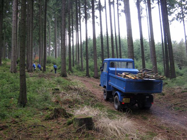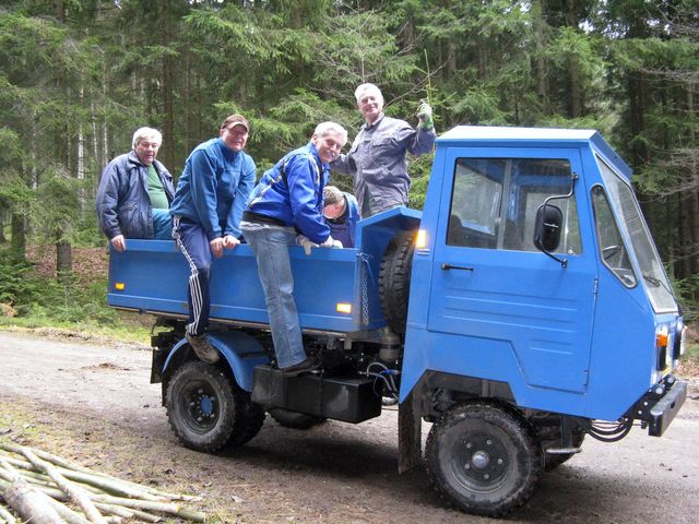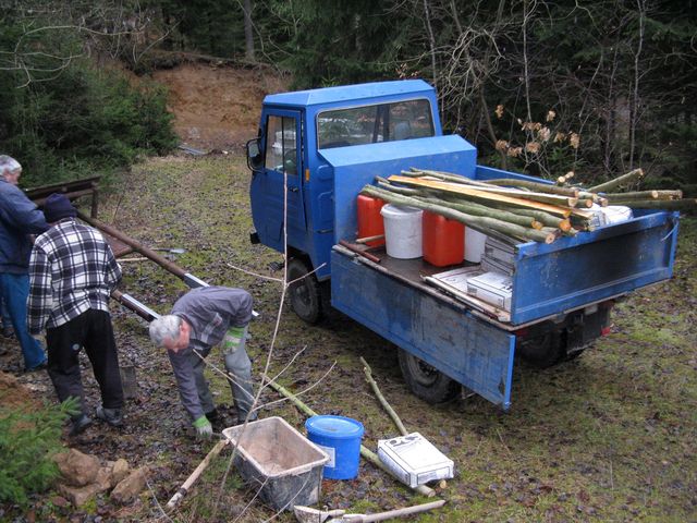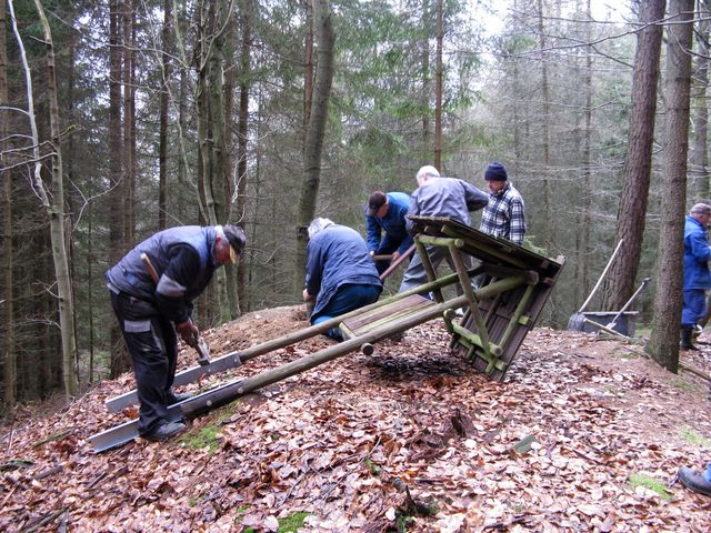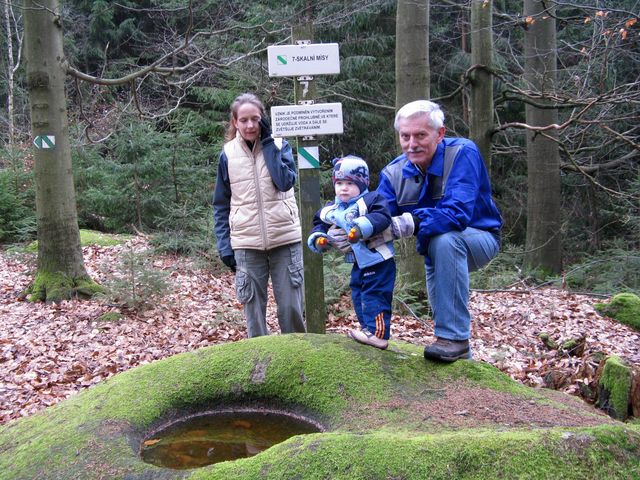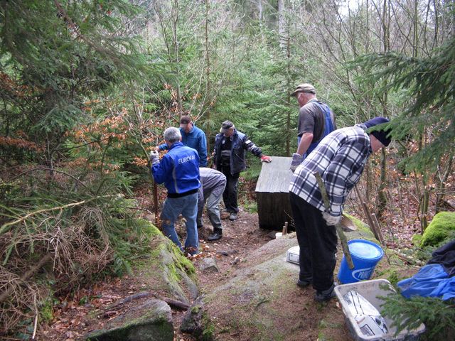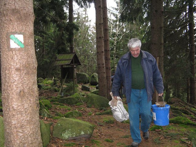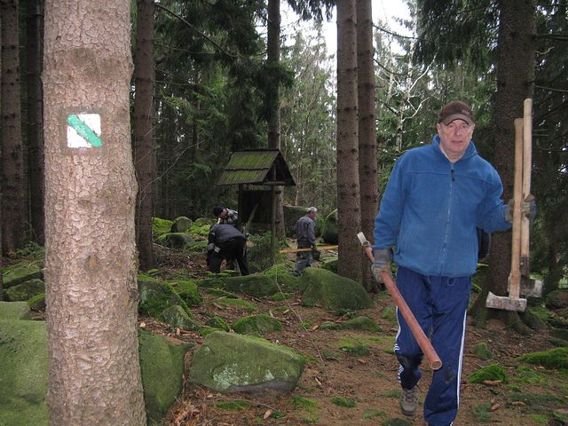 Mirek Novák, který řídil multikáru s materiálem a dobře zná zdejší lesní cesty, stanovil v této chvíli jako nejvýhodnější variantu přejezd k zastávce č. 7 – Skalní mísy. Tam přišla podpořit kolegy turisty členka KČT Tesla Jihlava, žijící v Dolní Cerekvi.