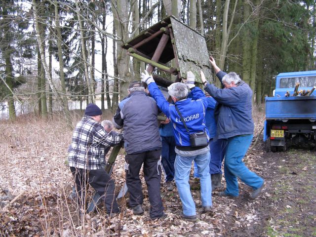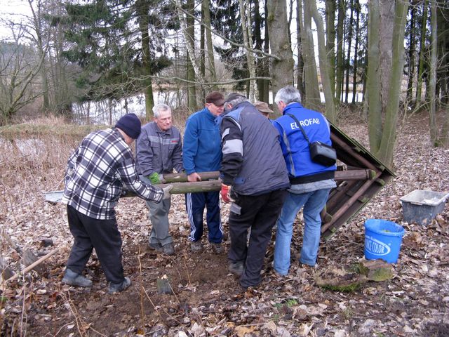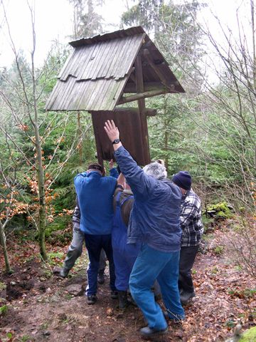 Následoval přesun na začátek naučné stezky, tedy k zastavením č. 1 a č. 14. Úvodní stanoviště také prošlo dřívější mimořádnou opravou, protože okolní terén je značně podmáčený – blízkost dvou rybníků a tůňky je užitečná mnoha živočichům, ale dřevěným nosníkům vůbec neprospívá.