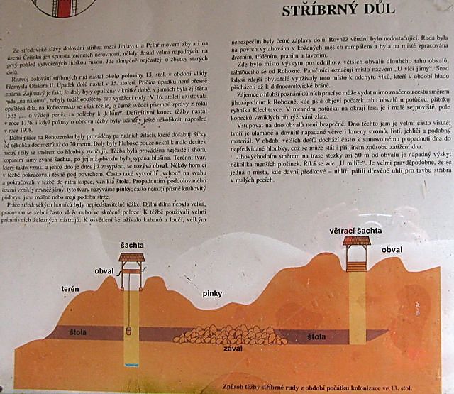 Atraktivní zastávku č. 13 s názvem „Stříbrné doly“ umístili tvůrci stezky na terénní nerovnosti zvané obval – pamětníci prý toto místo nazývali „U vlčí jámy“. Těžba stříbrných rud, která v těchto místech začala kolem poloviny 13. století, byla prováděna nejčastěji shora kopáním jámy, po jejímž obvodu byla sypána hlušina. Terénní tvar, který takto vznikl a jehož dno je dnes již zasypáno, se nazývá obval. Kromě šachet se těžilo i ve štolách. Úpadek dolování nastal v 15. století a přes pokusy v pozdějších dobách nebyla už těžba rud obnovena.