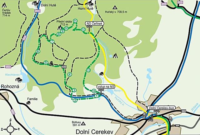 Před vstupem na Naučnou stezku Čeřínek je nejvhodnější doba seznámit se se základními údaji. Stezka je 6,5 km dlouhá, výchozí bod leží v nadmořské výšce 550 m u rybníka Chudý, necelé dva kilometry od Dolní Cerekve, nejvyšší bod se nachází na vrcholu Přední skály ve výšce 712 m. Stezka má 14 zastávek, ke kterým můžeme dojít oběma směry, prohlídka trvá asi 4 hodiny. Návštěvník se na ní seznámí s geologickými a geomorfologickými zvláštnostmi masivu Čeřínku – na území stezky, která vede Přírodním parkem Čeřínek, je řada biologicky cenných lokalit.