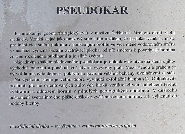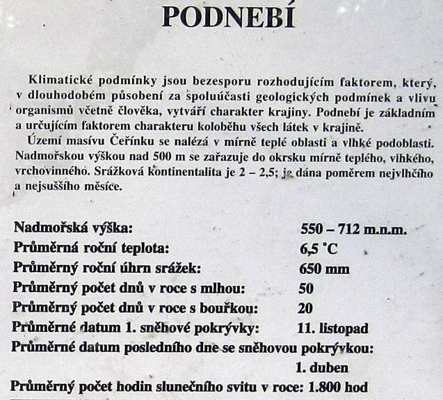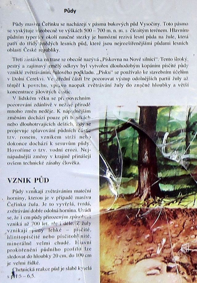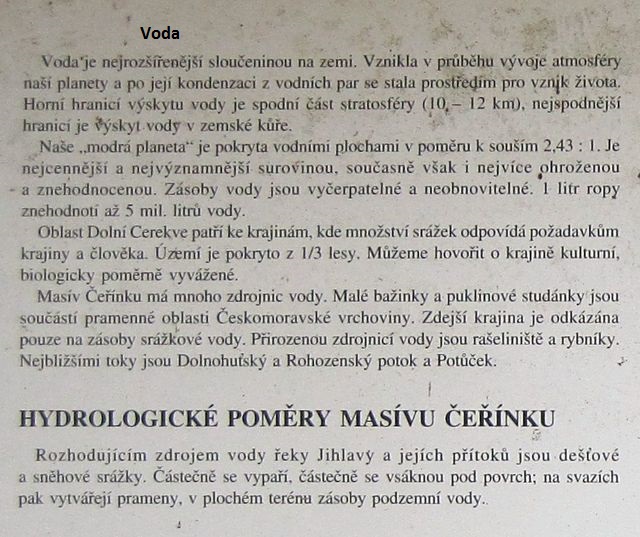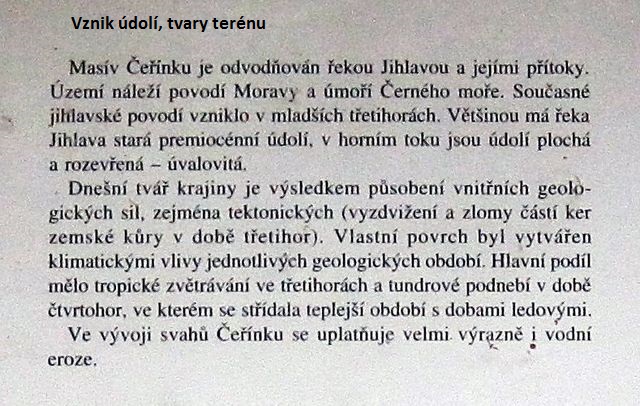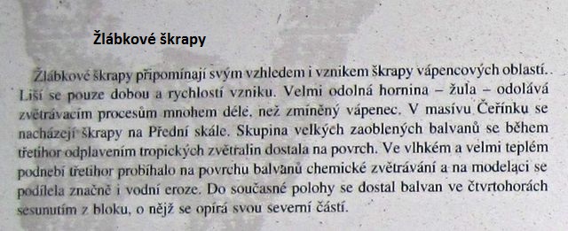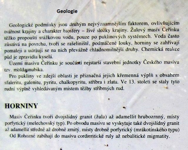 Pro úplnost uvedu texty na infotabulích – jsou vytvořené na podkladě Průvodce naučnou stezkou Čeřínek, která byla tiskem vydaná v roce 1989 – autor RNDr. Ortwin Tauber v ní populární formou zveřejnil své mnohaleté poznatky o lokalitě, která stojí za bližší poznání.