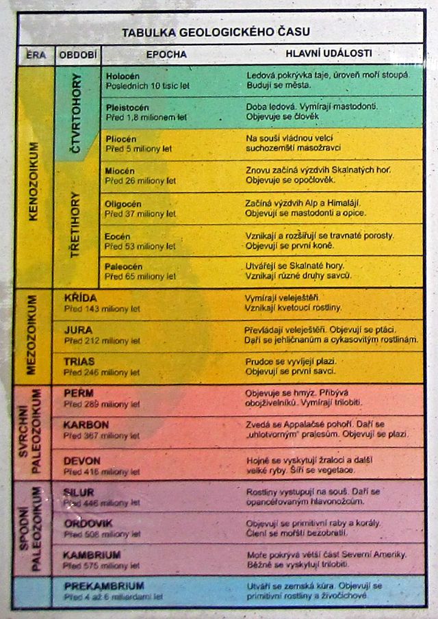 Zařazuji ofocenou Tabulku geologického času a věřím, že přes nedokonalost obrázku bude k užitku – nikde na internetu jsem totiž nenašla přehlednější než tuto, kterou vytvořil autor stezky: