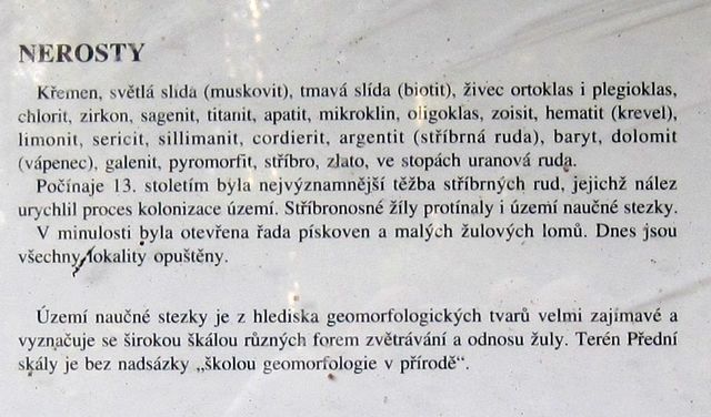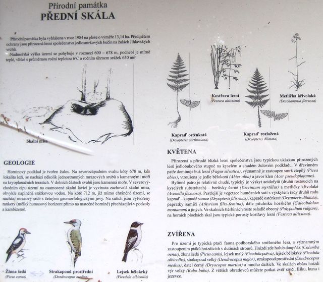 Ve třetihorách, ale hlavně ve čtvrtohorách, vznikly zajímavé mikrotvary na povrchu skalních výchozů nebo na povrchu izolovaných balvanů, v holocénu vznikly činností člověka četné antropogenní tvary povrchu. Pro území naučné stezky je příznačné zachování téměř nedotčeného stavu krajiny, zejména na západním svahu Přední skály a v její hřbetové části, což je z hlediska zachování přírodovědeckých a kulturních hodnot pro studijní účely nesmírně cenné.“