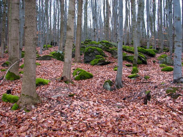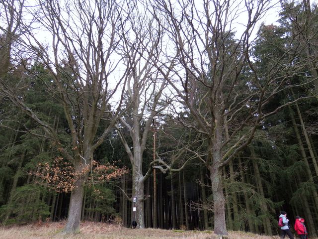 Nastala druhá půle vycházky: z kopce do Třeště – nejdřív lesem, ve spodnějších partiích kolem památného, více než 200 let starého, 40 metrů vysokého, ztepilého buku,