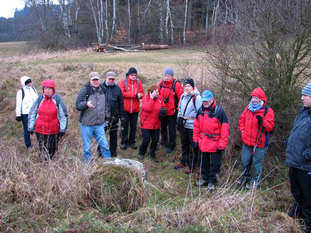 Pak nás Vašek zavedl na okraj osady, kde poblíž osamělého smrku, v úvozu, kudy v minulosti vedla cesta, sedí na stráňce křížový kámen. Na žulové desce se zaoblenými hranami je kříž a pod jeho příčným ramenem jsme rozpoznali reliéf meče s hrotem směřujícím k zemi, což znamená, že se tu stala tragická událost, která skončila smrtí. Nic bližšího však není známo.