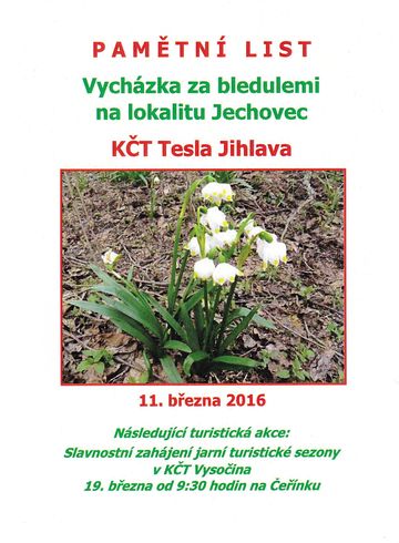 Před týdnem jsme se byli potěšit kvetoucími sněženkami na Velkém Špičáku – tím jsme dali vale zimě a naladili se jarně, což mimo jiné znamená zajít do lesa Jechovce u Staré Říše a stejně jako každý rok užasnout nad kobercem bílých květů vyrůstajících z nevábné mokřiny, proměněné asi na tři týdny v jeviště, na němž mají veleúspěšnou hlavní roli. Do fanklubu kvetoucích bledulí se počítáme i my, a tak jsme rádi přijali pozvání na vycházku, kterou tradičně pořádá KČT Tesla Jihlava.