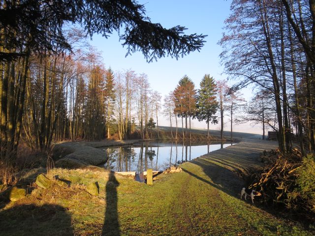 a začali stoupat po evropském rozvodí na Kopeček (627 m), z něj dolů do nadějovské kotliny k rybníkům právě nasvíceným ostrým ranním sluncem