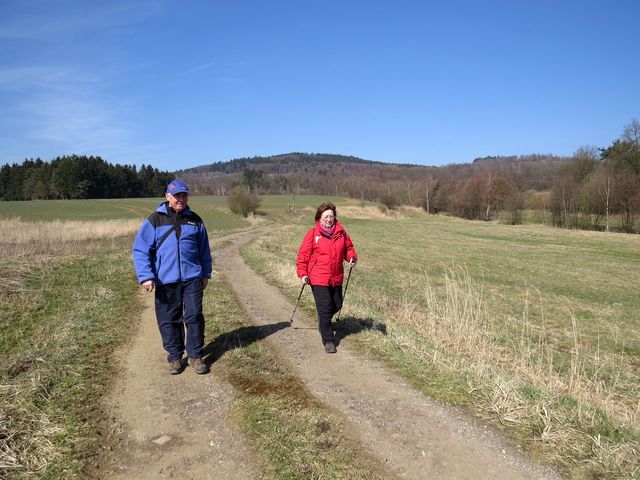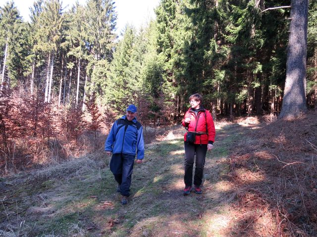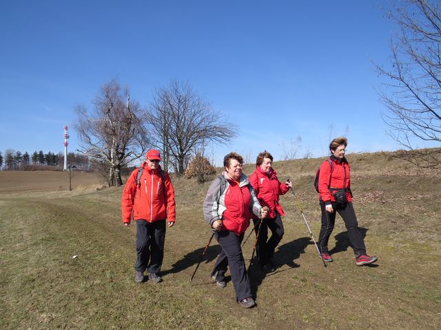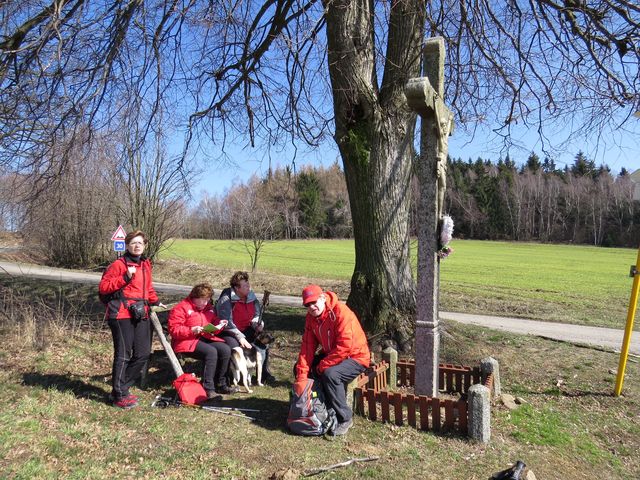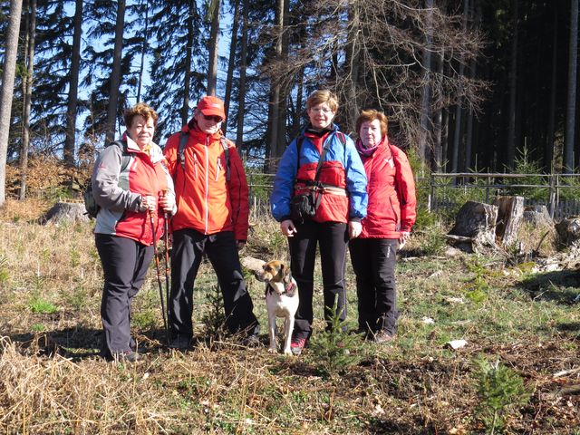 Jen náhodou připadl termín tohoto výletu znovu na velikonoční neděli jako loni – tehdy jsme šli sami dva, letos se přidali Jitka a Honza Korbelovi a Iva Svobodová s fenkou Adinou. Trasa byla naprosto stejná, proto těm čtenářům, které zajímá její podrobný popis a pozoruhodnosti na ní (evropské rozvodí Labe – Dunaj, prameny Šlapanky a Balinky, atraktivní vrchy Arnoleckých hor) nabízím odkaz na článek Po hřebeni Arnoleckých hor 2015, kde je i mapa trasy – dnes se zmíněných témat dotknu jen okrajově. 🙂