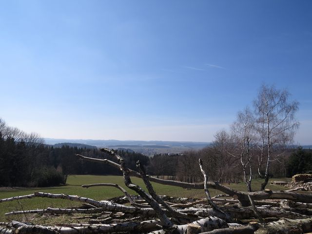 a znovu vzhůru na Kopaniny, pak od rozcestí Velký Ochoz do Stáje – tam už jsme z 27 kilometrové cesty ukrojili rovnou třetinu. Cesta byla dosti členitá a vítr nás nešetřil. Na náhorním plató u Stáje, nežli jsme zabočili na zalesněný hřeben Arnoleckých hor, jsme si, vítr-nevítr, vychutnali jeden z okouzlujících výhledů na Řehořovskou pahorkatinu.