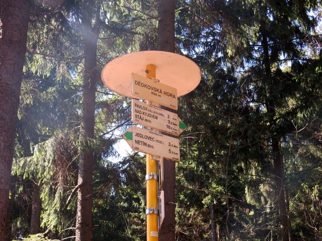 U směrovníku se setkává zeleně značená trasa se žlutou, přicházející od rozhledny Rosička na Žďársku – prohlédneme-li si pozorně mapu KČT, jistě oceníme, jak důmyslně je systém značených cest sestaven – propojuje jednotlivá místa tak, aby se turisté pohodlně orientovali a bez bloudění dosáhli zamýšleného cíle.