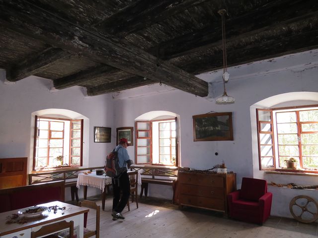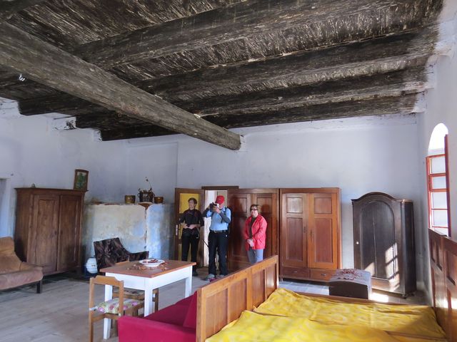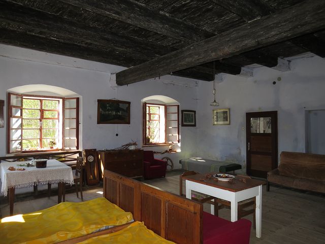 malé obci s asi stovkou obyvatel – u cesty nás nemohla neupoutat rozlehlá, starobylá budova s bohatě zdobenou štukovou fasádou – vstřícný pán sekal kolem domu trávu a rád nám nejen pověděl historii místní rychty, ale dokonce nás pozval na její prohlídku.