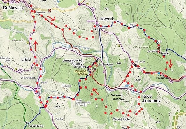 V Daňkovicích za statkem se dáme po červené TZ směrem na Jimramovské Paseky. Před Pasekami pod elektrickým vedením vysokého napětí opustíme červenou a podél horního remízku pole pokračujeme na Javorek. Zde se napojíme na modrou TZ, která nás dovede na Prosičku. Odsud pokračujeme ještě asi 200 metrů po MTZ a v místech, kde modrá odbočuje prudce vlevo, pokračujeme rovně lesem z kopce do té doby, než se napojíme na zpevněnou lesní cestu s červenou TZ – zde se dáme vpravo a pokračujeme po červené přes osadu Na Louži až do Nového Jimramova. Zde opustíme červenou TZ a vlevo projdeme celou obcí. Pak se dáme přes mostek doprava a stoupáme nahoru na Široké Pole. Jdeme po cestě okolo chalup, a když cesta končí, pokračujeme podél remízku až za poslední chalupu, zde vede cesta vlevo do lesa. Jdeme lesní cestou po vrstevnicích, až se dostaneme na modrou a na Štarkov. Ze Štarkova se vydáme kousek zpět po modré, která vede mezi několika chalupami – Nové Jimramovské Paseky. Cesta vede podél remízku u pole, projdeme lesíkem a před Bohdaleckým lesem odbočíme prudce vpravo na cestu vedoucí do Dolní Líšné. Ves projdeme až nahoru k silnici, po které dále pokračujeme do Líšné na náves, tam odbočíme mírně vlevo a sejdeme tak z hlavní silnice. Po zemědělské cestě se dostaneme zpět do Daňkovic.