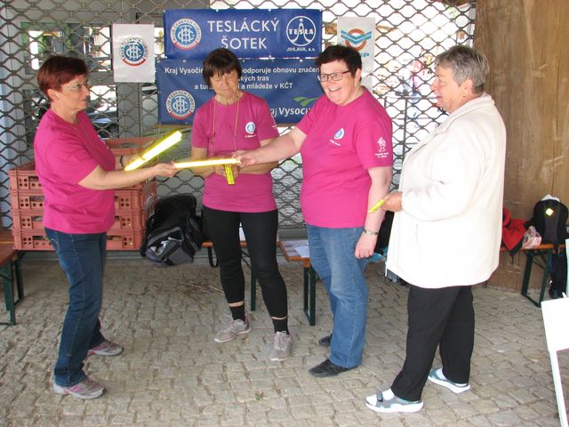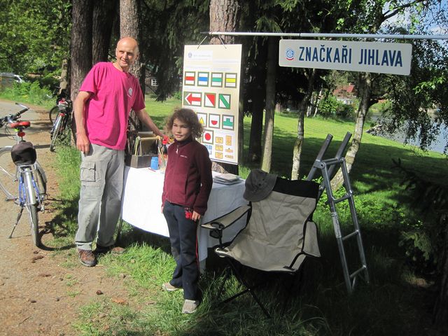První zastávka byla tradičně na Okrouhlíku – od Jarky Balíkové jsme dostali kontrolní razítko do „šotkolistu“ a přihlíželi dění na stanovišti vedoucího značkaře obvodu Jihlava Standy Balíka, který nejen zodpovídal dotazy účastníků ohledně značení pěších turistických tras, ale hlavně byl nápomocen radou těm, kteří si chtěli vyzkoušet, jak se maluje turistická značka – po více či méně úspěšném dokončení díla se všichni „nováčci“ shodli, že zhotovit předpisovou značku je složitější než se na první pohled zdá… 🙂