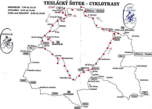 …a za chvíli jsme se zdravili s Libuškou a Ludvíkem, kteří na „kološotky“ čekali u cyklotrasy č. 26 Jihlava – Raabs an der Thaya, aby razítkem potvrdili, že jsme projeli kontrolním stanovištěm v Lukách nad Jihlavou. ( O městečku a jeho okolí se dočtete ve článku Vílanec – Luka nad Jihlavou)