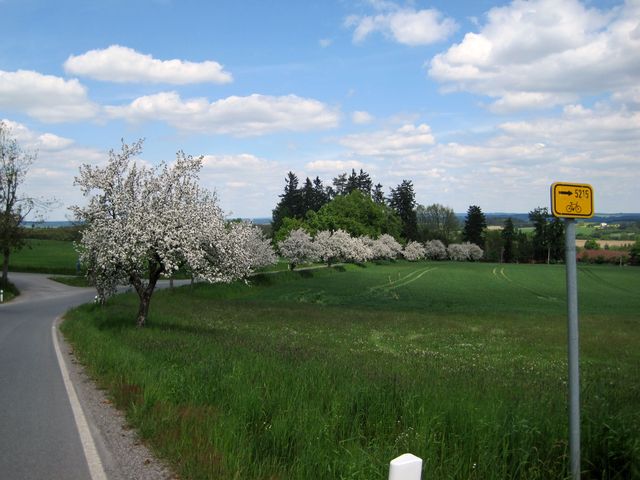 Cyklotrasa č. 5215 je vedená krajinou tak, aby cyklisté dostali za putování členitým terénem okamžitou odměnu v podobě dalekých výhledů – těch jsme si v dnešním vpravdě jarním, slunečném dni užili