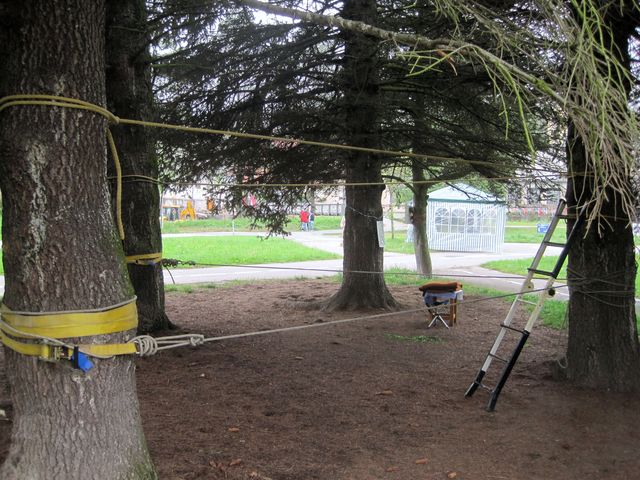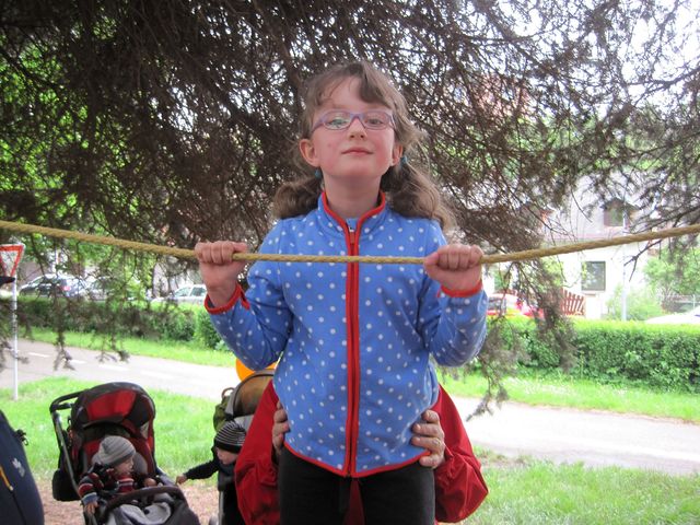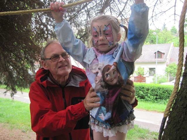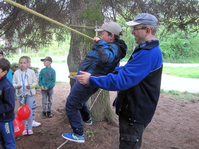 Jak probíhá Cesta pohádkovým lesem jsem popsala ve článku z roku 2014, kde jsou i odkazy na minulé ročníky, tedy veškeré potřebné informace o organizačním zajištění zábavného a soutěžního odpoledne pro mladší děti. Dnes tedy jen uvedu, že jsme už tradičně byli pověřeni prací v „lanovém centru“, které po stavební a odborné stránce zajistil člen našeho odboru Miloš Veselý a s ním se o bezpečnost malých provazochodců starali Honza Korbel a Mirek, já jsem měla důležitou a vděčnou funkci: razítkem potvrdit do účastnického průkazu úspěšný přechod po laně a věnovat každému borci dáreček od našeho odboru. 🙂