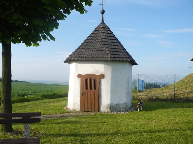 Asi po třech stech metrech mírného stoupání jsme došli ke kapličce, odkud je překrásný kruhový rozhled.