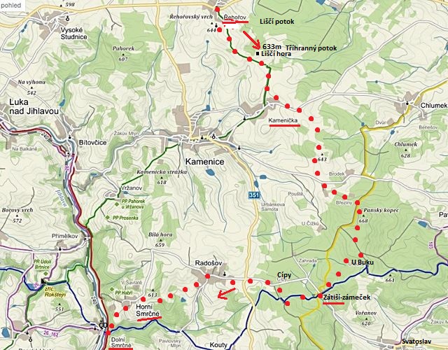 Trasu, kterou nabídl pro turistický výšlap Ing. František Smejkal z KČT Čeřínek Jihlava, málokterý z 15 účastníků v úplnosti znal – se zájmem jsme v Řehořově, kde vycházka u autobusové zastávky začínala, vyslechli denní program a těšili se na výhledy a zajímavé informace. Vydali jsme se, trochu nepřesně řečeno, jižním směrem k 645 metrů vysokému Řehořovskému vrchu, poblíž něhož stojí zdaleka viditelná barokní kaplička sv. Antonína. Nežli jsme k ní došli, cesta nás vedla kolem bělostných Božích muk, postavených v roce 1689 jako poděkování za odvrácení moru.
