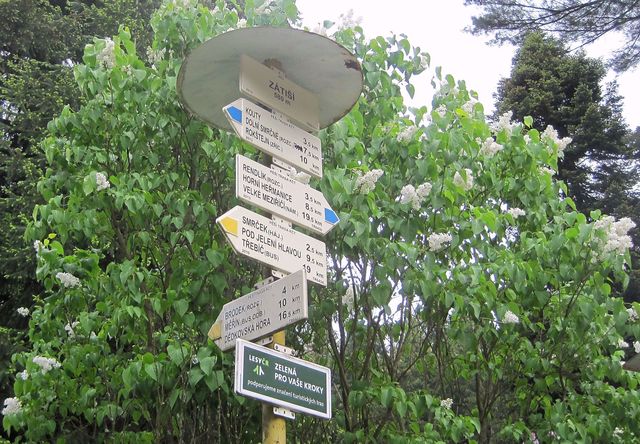 Z textu tabulek na směrovníku u silnice je patrné, kde se nacházíme