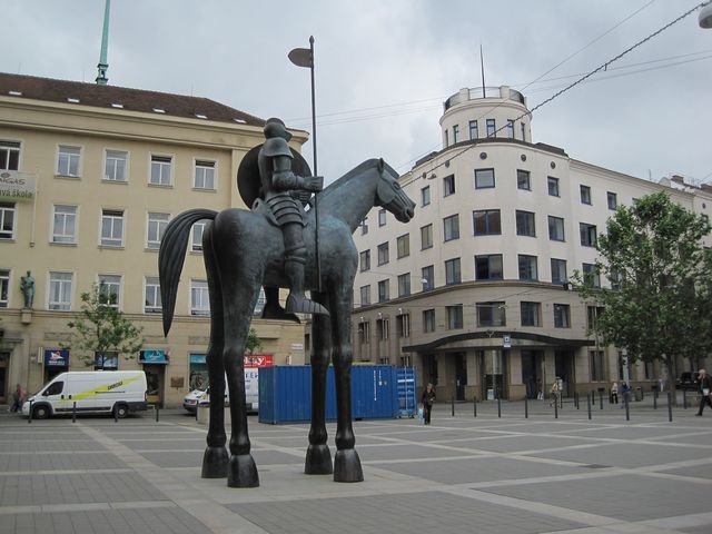 Na první pohled si každý všimne, že chybí sokl, skoro čtyřmetrové nohy koně spočívají přímo na dlažbě – socha prý váží asi čtyři tuny a hrot jezdcova kopí je ve výšce osm metrů – pro vyniknutí výsledného díla v otevřeném prostoru je podle odborníků zvolené měřítko adekvátní. Bronzový kolos, za který město zaplatilo téměř sedm milionů korun, odlila dílna Miloše Vacka.