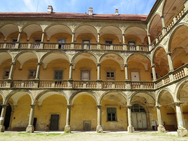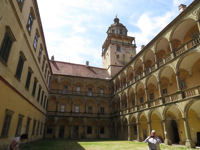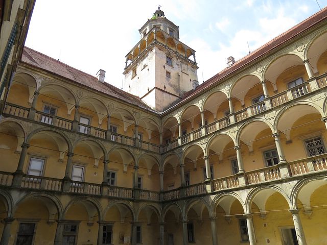 Tři podlaží unikátních zámeckých arkád dosahují do výše přes 16 metrů, na pilířích a stěnách je reliéfní výzdoba – erby pánů z Lipé a rodů s nimi spřízněných dodnes překvapují svou propracovaností, v arkádách se střídá toskánský, jónský a korintský sloh – lehce se vznášejí nad uzavřeným dvorem, do něhož shlíží jen slunce shora…