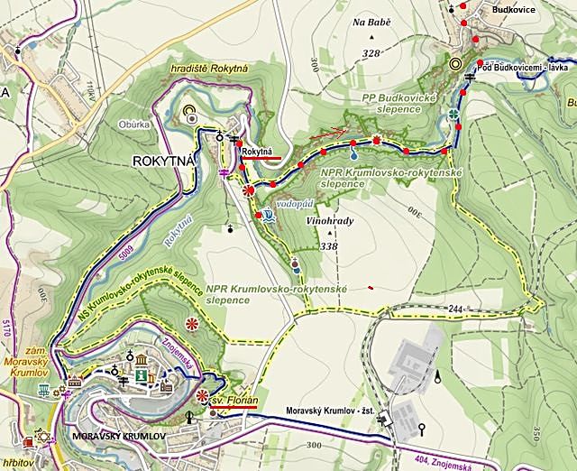 a míříme do jeho místní části Rokytná, odkud se vydáme po modře značené turistické trase, která nám umožní projít úsekem naučné stezky Krumlovsko-rokytenské slepence. Řeka Rokytná, jejíž tok nebyl v této oblasti nikdy upravován, a proto si zachovala přirozené meandry, vymodelovala údolí, které bylo pro svou jedinečnost vyhlášeno Národní přírodní rezervací. Vzniklo ideální prostředí pro mnoho druhů živočichů – dočetla jsem se, že v norách na břehu řeky hnízdí ledňáček říční…