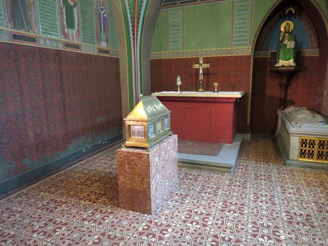 Z chóru scházíme po schůdcích do Konrádovy kaple s relikviářem – biskup Konrád z Kostnice byl prohlášen za svatého.