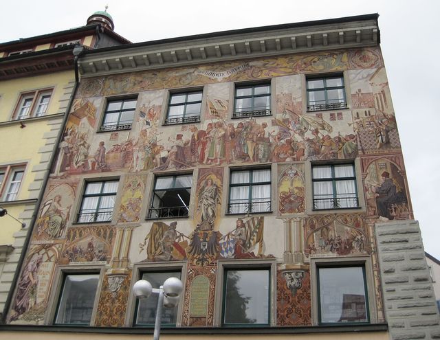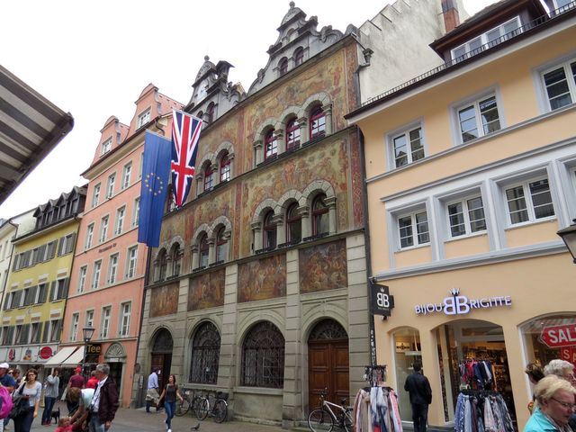 Z náměstí jsme se vydali k radnici, jejíž celou čelní frontu pokrývá nádherná freska z roku 1594, která zachycuje důležité momenty z historie Kostnice. (Jak nemyslet na tu chudinku zanedbanou vzácnou fresku v jihlavské Znojemské ulici!!)