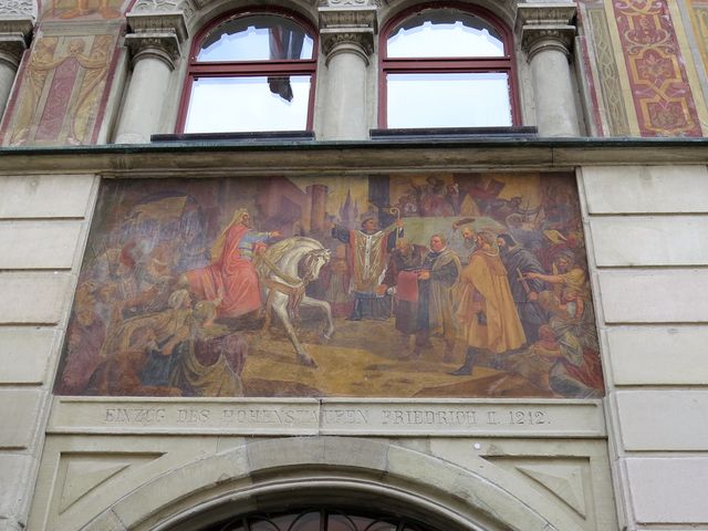 ani kolem domu Zum Hohen Hafen na náměstí Obermarkt nepřejde kvůli překrásné freskové výzdobě nikdo bez povšimnutí.