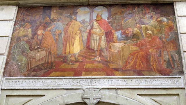 Fridrich I. Barbarossa uzavírá v roce 1183 mír se spolkem severoitalských (lombardských) měst, tzv. Kostnický mír