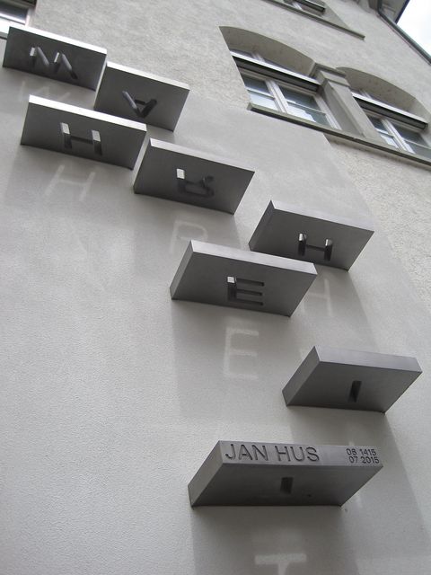 a pokračovali v prohlídce, na fasádě rozlehlé budovy (snad společenské centrum) nás upoutala zajímavá výtvarná instalace věnovaná Husovi: