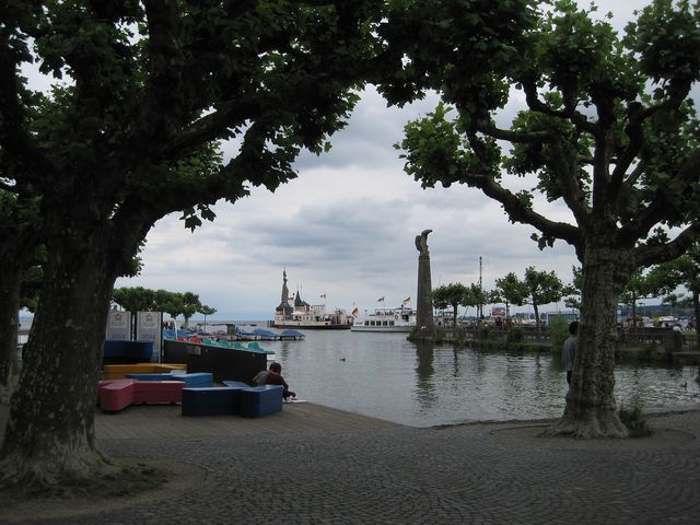 v přístavu před odjezdem - vzadu vlevo věž katedrály, uprostřed památník hraběte Zeppelina, syna města Konstanz (jak je psáno na sloupu); www.svatosi.cz