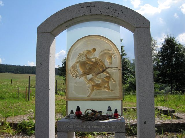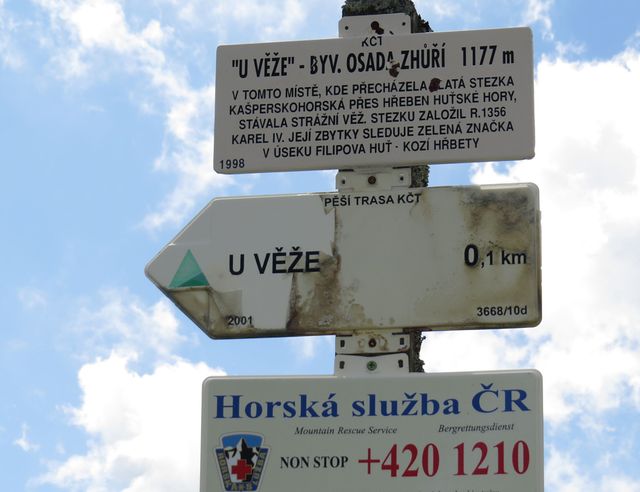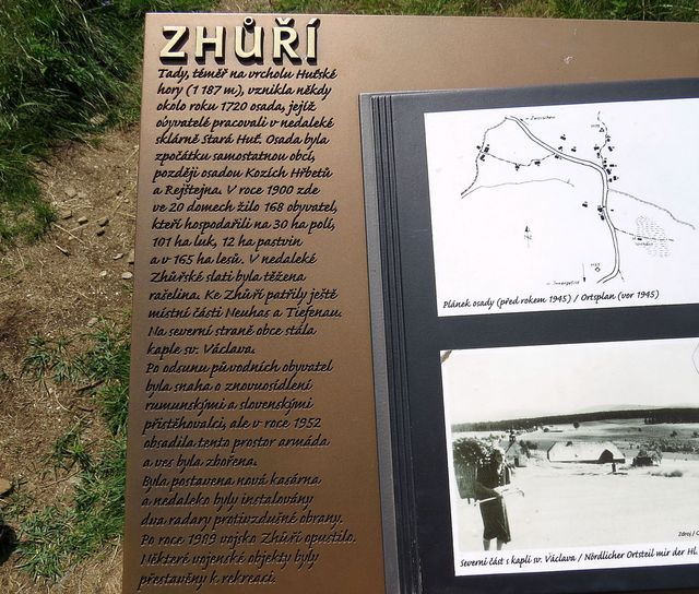 Až na Zhůří a pak na vrcholek Huťské hory (1 187 m n.m.) jsme stále stoupali – z holého hřebene jsme ale krásně viděli Roklany, Poledník, Antýgl a bájný věnec pohraničních hor ozdobených nad temeny kyprými bělostnými mraky lehounce usazenými na nebesky modré obloze. Ta milostná krajina nedávala vůbec najevo, že v těchto končinách kdysi vedla Zlatá stezka a že ze svahu hory až na pár křížků beze stopy zmizela osada Zhůří (Haidl) i s lidmi, kteří v ní žili… Zůstaly jen tabulky, které si ne každý poutník přečte…