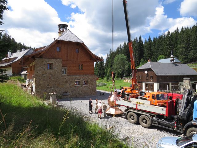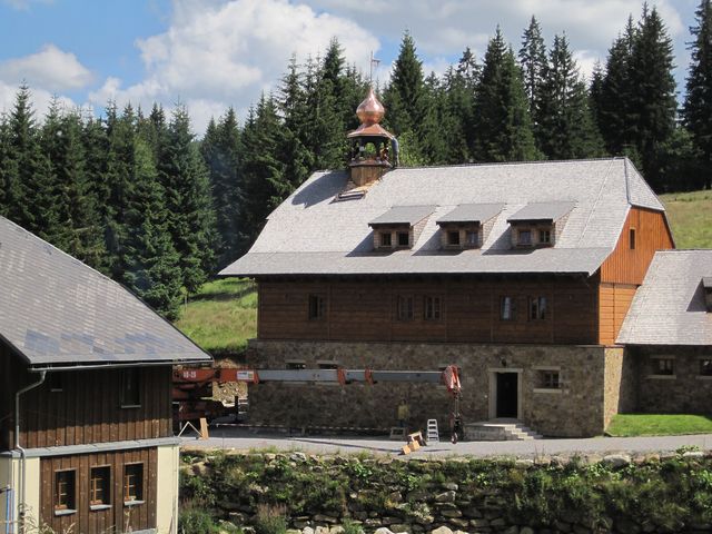 Ukázkové počasí v úterý 19. července nás inspirovalo k dlouhému výletu po okolí s výjezdem na Černou horu (1 315 m) – z Borových Lad jsme jeli známou cestou na Kvildu, pak na Horskou Kvildu, do Filipovy Hutě a na Modravu – místa turistům zaslíbená, kterých člověk v jednom dni může vlastními silami dosáhnout jen na kole. Na Modravě v objektu nového pivovaru právě probíhala instalace měděné vížky na střechu jedné z budov. Podoba věžičky nevybočovala ze stylu charakteristického pro tuto šumavskou oblast.
