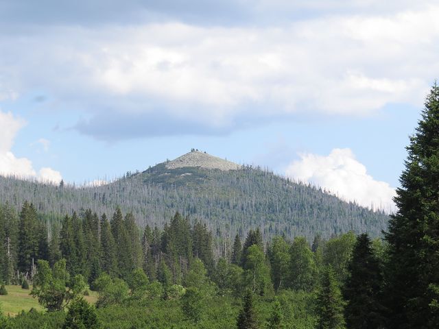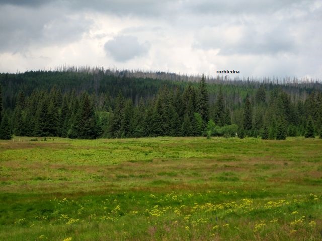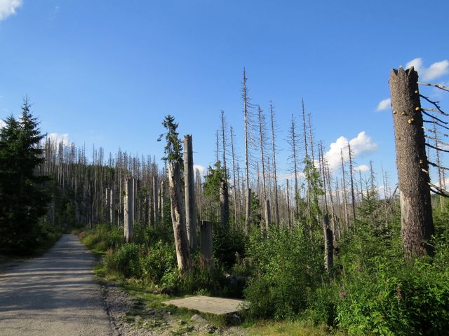 U Javoří pily jsem si všimla, že stromy na hřbetu i úbočích Poledníku (1 315 m) jsou zcela suché, trčí jen holé pahýly, takže rozhledna je vidět pouhým okem od rašeliniště u Tmavého potoka!