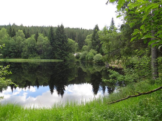 Na Knížecí Pláně jsme jeli cyklostezkou č. 1040, pak až do Žďáreckého sedýlka po č. 1023, tam jsme odbočili vpravo a frčeli po zřejmě loni nově vybudované asfaltce ke Žďáreckému jezírku, kde panoval nebeský klid – hladina se ani nehnula, aby neporušila zrcadlící se oblaka a stromy – lesní idyla jako z filmu o přírodě…