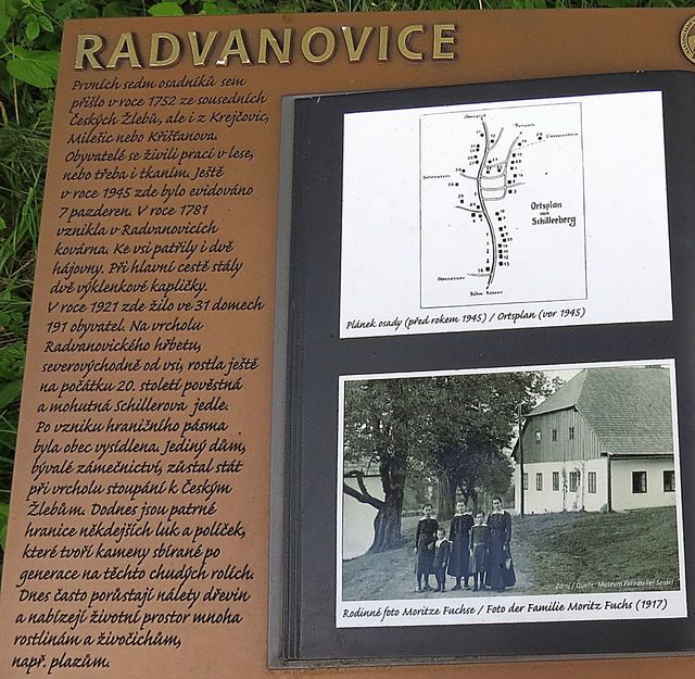 Na okraji Strážného, blízko domu, kde na střeše svítí nepřehlédnutelné červené srdce, je turistické odpočívadlo 🙂 , kde jsme posvačili, abychom se posilnili na cestu do Českých Žlebů, což znamená nejméně 5 kilometrů do vrchu. Za Strážným, na Hliništi, jsme odbočili vpravo a dále jeli cyklostezkou č. 1025. Na svahu úmorně dlouhého Radvanovického kopce, z něhož ale byl skvělý výhled, jsme se zastavili u pamětní desky sdělující zvídavému poutníkovi v pár řádcích dvě stovky let trvající historii obce Radvanovice (Schillerberg), která se kdysi na svazích hřbetu ve výšce okolo 1 000 metrů nad mořem rozkládala a prosperovala.