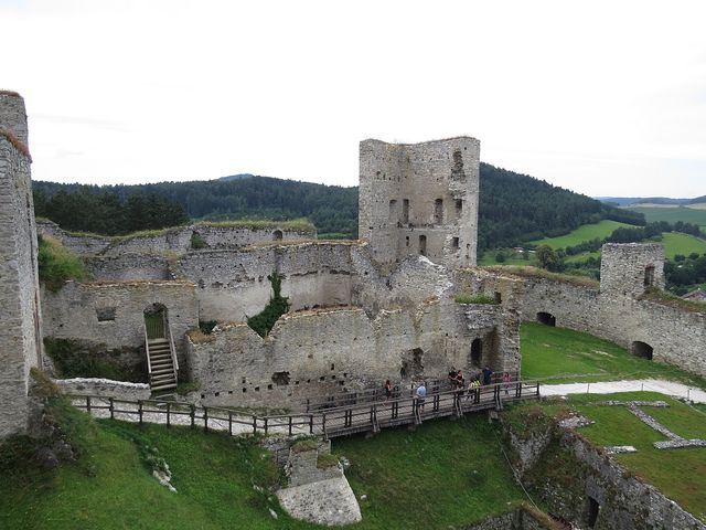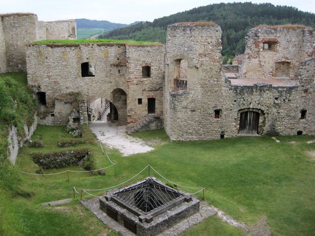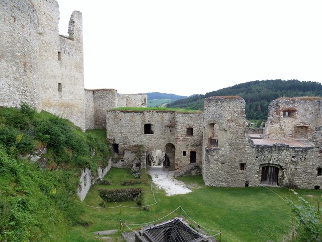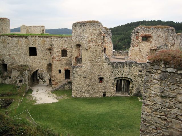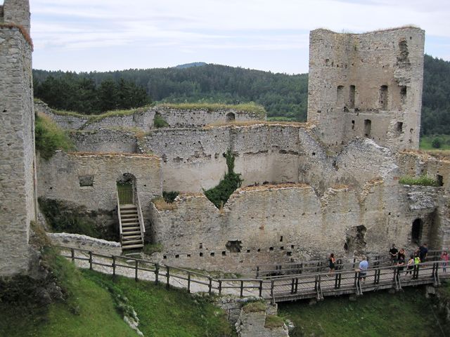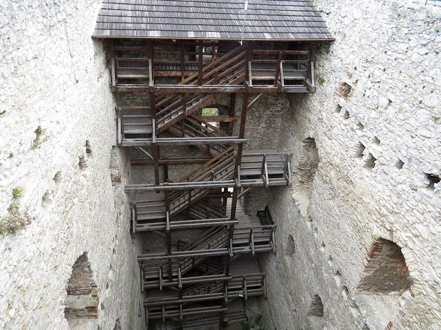 V pokladně nabízeli dva téměř hodinové prohlídkové okruhy – lačně jsme po stokoruně zakoupili oba – nejdřív věž a rozsáhlá hradní sklepení, potom palác a podzemí. Výhledy z věže na město a okolí stojí za výstup do horních pater udržované zříceniny.