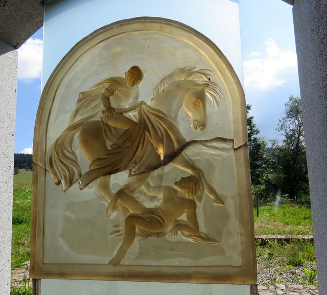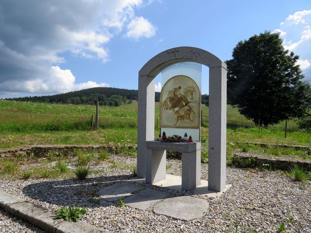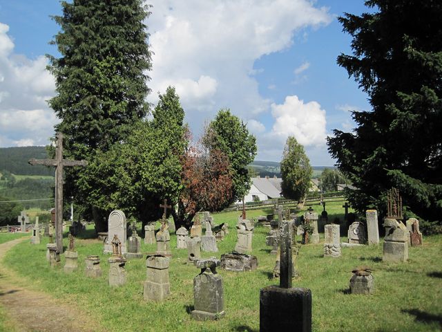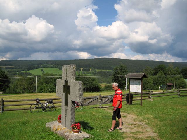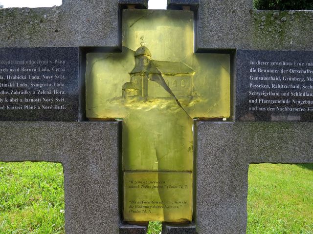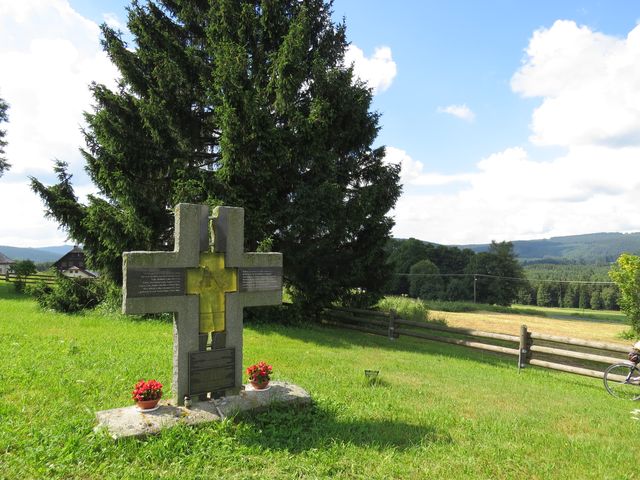 V sobotu ráno 23. 7. 2016 jsme sbalili svých pár švestek, uložili zavazadla do auta, a že bylo tak krásně, objeli jsme na kolech dvanáctikilometrové rozlučkové kolečko po nejbližším okolí: Svinná Lada – Nové Hutě – Šindlov – Nový Svět – Borová Lada. Největší pozornost jsme věnovali obci Nový Svět, konkrétně obnovenému původnímu hřbitovu z doby, kdy se ještě nazývala Neugebau. Příběh tohoto místa jsem popsala v níže uvedeném článku z roku 2014, ale několik fotek zde znovu vložím, protože byl malebný slunný den a skleněný kříž u vchodu i oltář Vladimíry Tesařové na místě původního kostela sv. Martina zbořeného v normalizačních sedmdesátých letech zářily ze všech sil a rozdávaly radost.
