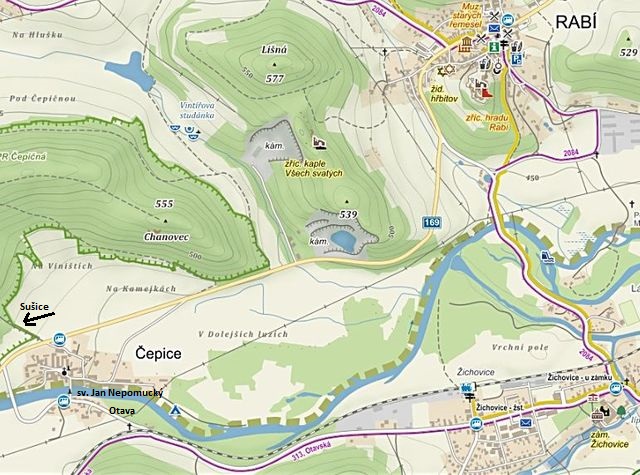 Nezajet se podívat do blízkého Rabí by byla promarněná příležitost – město, nad nímž se na skalnatém ostrohu vypíná nejrozsáhlejší hradní zřícenina v Čechách, čítá jen 500 obyvatel, ale v minulosti, hlavně v období, kdy zdejší panství vlastnil bohatý rod pánů ze Švihova, jehož příslušníci byli ve službách u dvora, bylo významné a respektované. Hrad s mohutným opevněním vznikl asi na začátku 13. století, aby chránil obchodní stezku a rýžoviště zlata na řece Otavě.