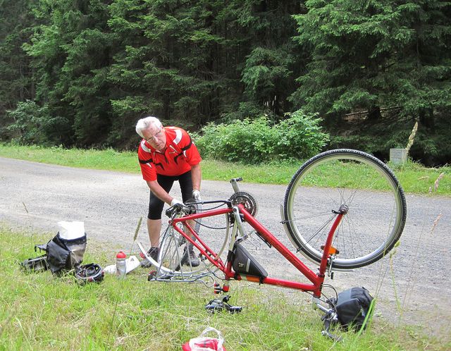 Vydali jsme se pod Oblík, kde není pohled na okolní les (zatím) tak stresující, ale výletní pohoda byla náhle narušená: přední kolo mého bicyklu splasklo – ještě že mám po boku svého servismena a pečovatele – svižně duši, kterou prý propíchl velmi ostrý malý kamínek, během chvíle opravil a jelo se dál na Tříjezerní slať. Zachtělo se nám projížďky kolem Vchynicko-Tetovského kanálu, tak jsme sjeli na Hakešickou cestu a směřovali k Hauswaldské kapli. Naše další plány změnila nepříjemná událost – duše Mirkova zadního kola asi záviděla jeho péči věnovanou kolegyni, a tak se důrazně připomněla! Sebrala cestou první trn, který uviděla a způsobila si vážné zranění… Kdyby takový příběh napsal autor do scénáře, považovali bychom ho za nepravděpodobný – ale život holt tropí hlouposti. 🙂
