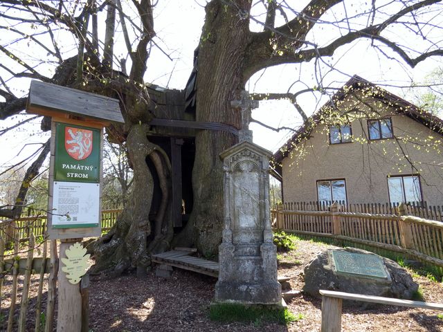 V dutině hlavního kmene jsou vzdušné kořeny, vlastní vahou rozlomené větve chrání stříšky – strom péči oplácí a prospívá, dodnes k němu přicházejí poutníci – značkaři KČT tudy vedou pěší značené trasy. 🙂