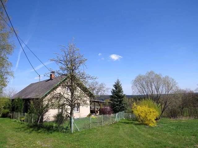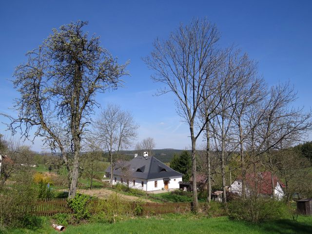 Vrátili jsme se k autu, které čekalo na parkovišti poblíž Královské lípy a jeli směrem k Nasavrkům. Silnice vede náhorní plošinou a výhledy na hřeben Železných hor jsou za tak dobré viditelnosti, která nám byla dneska dopřána, opravdu záviděníhodné. U Rušinova jsme opět nechali Pežotka čekat a vydali se do osady Nohavice – čím výš jsme stoupali, tím širší obzor se nám otevíral – jedno ze stavení, k jejichž součtu není třeba ani prstů jedné ruky, bylo to památeční – Jitka se ujistila, že místo zrodu jejích předků je, kde bývalo, a tak jsme se měli k odchodu. 🙂