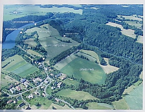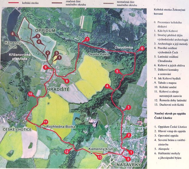 Z vnějšího okruhu stezky jsme zvědavě zabočili i do míst, kde bylo na vrcholové plošině široké ostrožny v meandru řeky Chrudimky ve 2. polovině 2. století př. n. l. vybudováno ve výšce 430 – 460 metrů oppidum. Archeologové tu prokázali osídlení už v mladší době kamenné, ale nejvýraznější pozůstatky ukazují právě na keltské osídlení – opevněné hradiště zabíralo plochu přes 20 hektarů, k němu přiléhalo neopevněné předhradí o velikosti asi 10 hektarů.