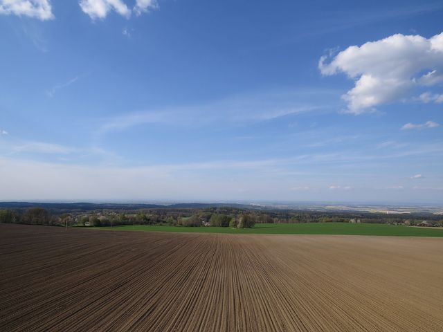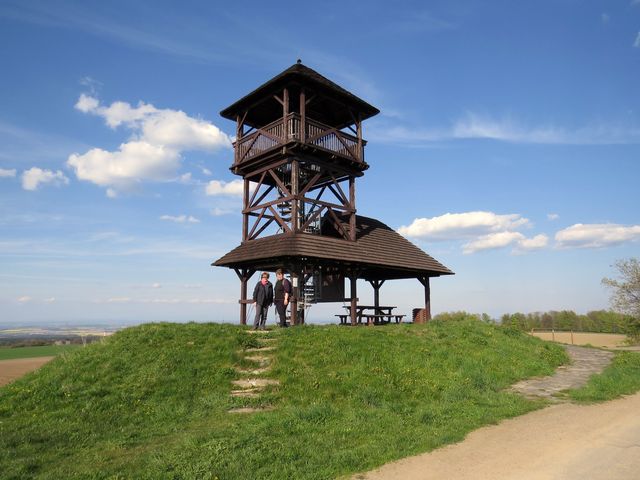Ze zalesněného údolí jsme stoupali na otevřenou náhorní plošinu, odkud byl výhled do rovin u Pardubic, ale i na místa, kde bývalo keltské sídliště. Pro ještě lepší zážitek při obzírání krajiny byla v roce 2006 vybudována dřevěná, 14,5 metru vysoká rozhledna s vyhlídkovou plošinou ve výšce 11 metrů, kam se návštěvníci dostanou po 32 schodech – rozhled je fantastický!