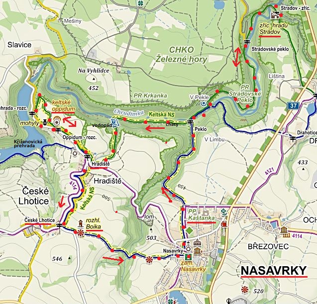 Devět kilometrů z Lipky do Nasavrk nás stálo jen pár minutek, krátce po poledni jsme zašli do Íčka sídlícího v zámku a dozvěděli se všechno, co jsme potřebovali. Vybaveni mapkami a dobrými radami stáli jsme na začátku 9,5 km dlouhé trasy Naučné Keltské stezky Železnými horami. Při pohledu na mapu jsme ale věděli, že určitě neodoláme atraktivním nabídkám v okolí…