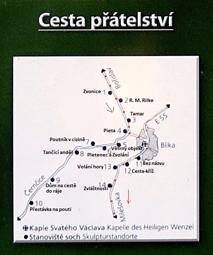 Po vystoupení z vlaku jsme se žlutě značenou cestou vydali k zalesněným kopcům – trasu jsme znali jako sestupovou z minula, proto jsme se těšili do Bílky na kapli sv. Václava a na sochy v otevřené krajině, tzv. Cestu přátelství, která zdobí kraj pod Milešovkou od roku 2002.