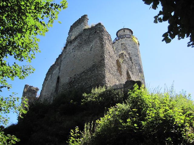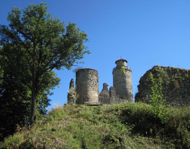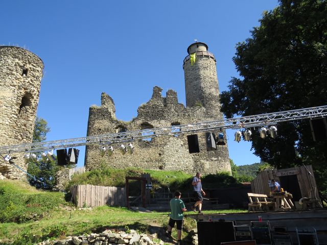 Jako každý hrad, má i tento svoji pověst: v roce 1434 dobyl hrad husitský vůdce Jakoubek z Vřesovic, po bitvě u Lipan přešel od husitů na stranu císaře Zikmunda, a proto za trest nenašel po smrti klidu – bloudí hradem a na čele má znamení černého kalicha… Žádné strašidlo jsme nenatrefili, i když příležitost se naskytla – na nádvoří bylo dost živo, protože se chystala scéna pro muzikál, který se měl v areálu večer hrát, a přítomné děti, zpovykané prázdninovou volností, pobíhaly bez dozoru – jednomu z nich přišlo velmi zábavné zhasnout dole u vstupu osvětlení strmého schodiště ve věži, z jejíhož ochozu jsme vyhlíželi. 🙂 Chvíli trvalo, nežli jsme se z té výšky dovolali na nádvoří – sestoupit po tmě by byl i bez setkání s proradným husitou hazard. 🙂