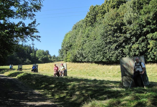 Stoupali jsme červeně značenou cestou po úbočí a využili nabídky k odpočinku a vnímání krajiny z lavic k tomu určených, které autor Jan Mladovský nazval Zvláštnosti: